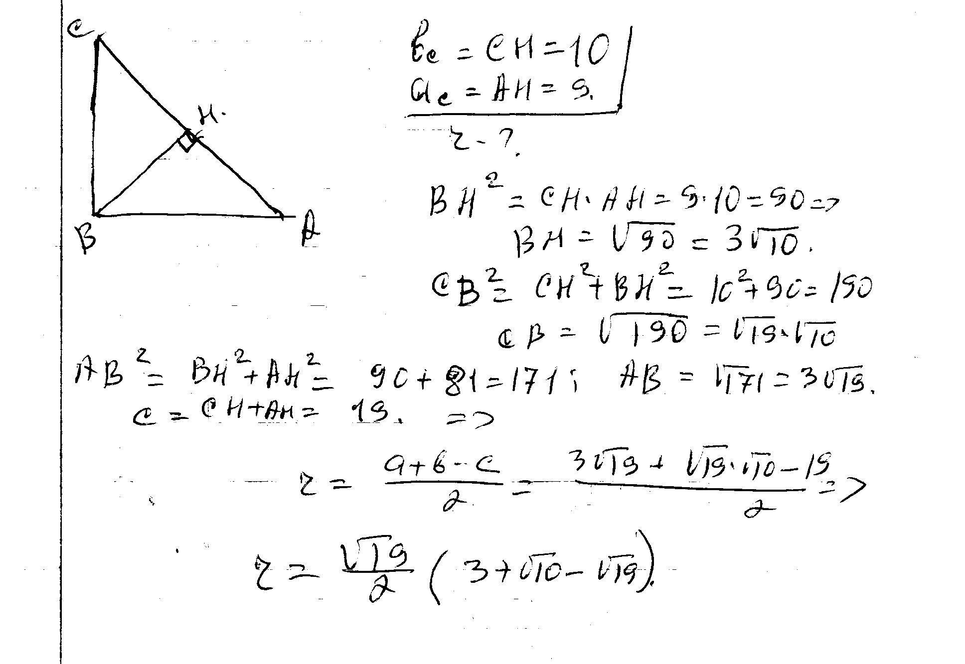 Найдите радиус круга, вписанного в прямоугольный треугольник, если проекции катетов на гипотинузу равны 9 и 10 см.