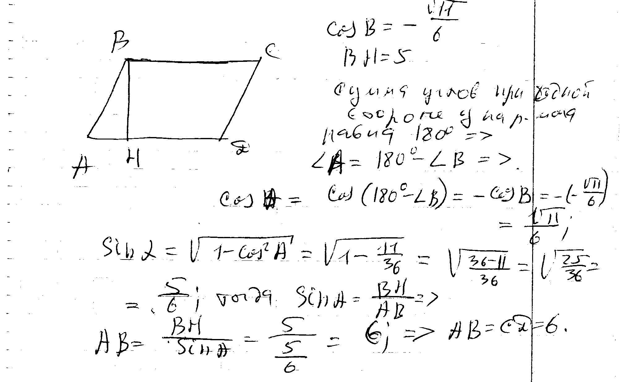 В параллелограмме ABCD косинус B равен минус корень из 11 деленное на 6 высота опущенная на сторону AD D равно 5 Найдите CD