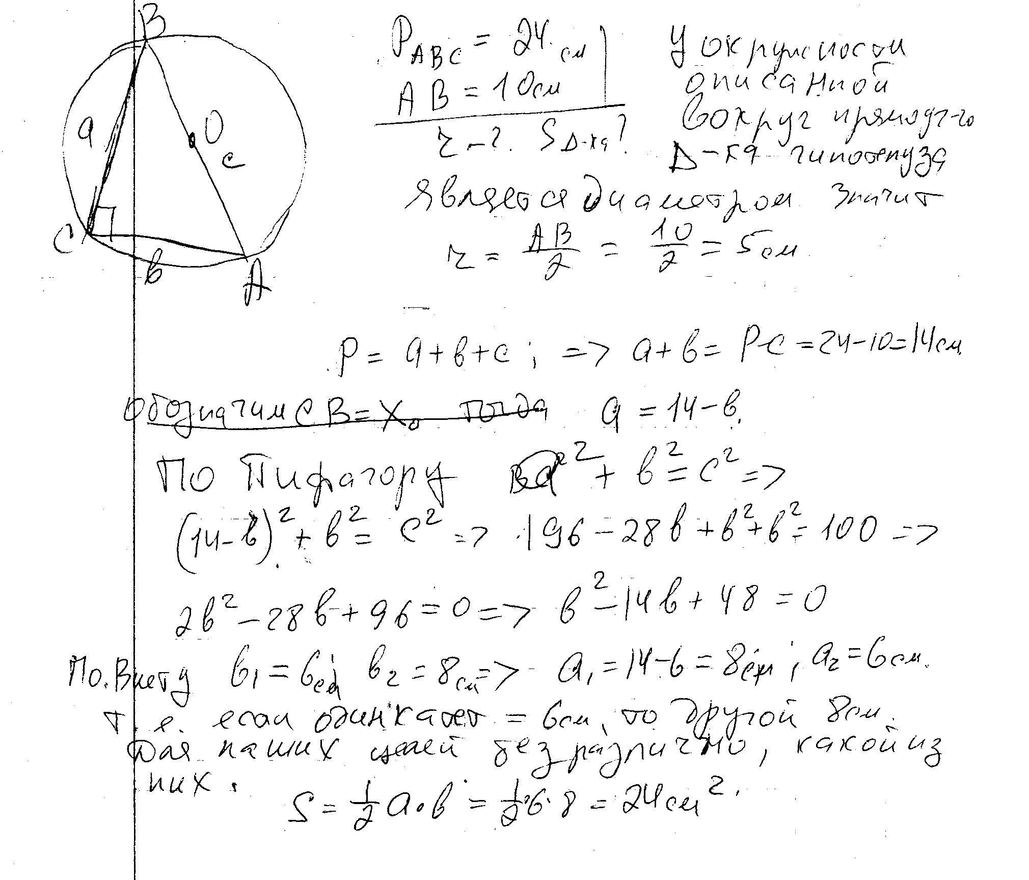 Периметр прямоугольного треугольника равен 24 см, а его гипотинуза 10 см. Найдите радиус описанного круга и площадь треугольника.