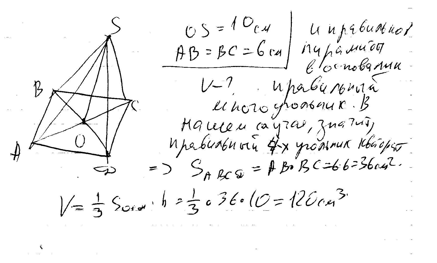обчисліть об*єм правильної чотирикутної пірамиди сторона основи якої дорівнює 6 см а висота 10см