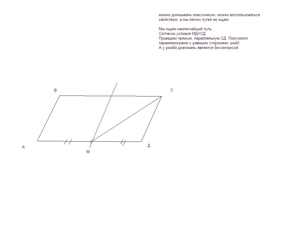 Стороны AD параллелограмма ABCD вдвое больше стороны CD. Точка M - середина стороны AD. Докажите, что CM - биссектриса угла BCD