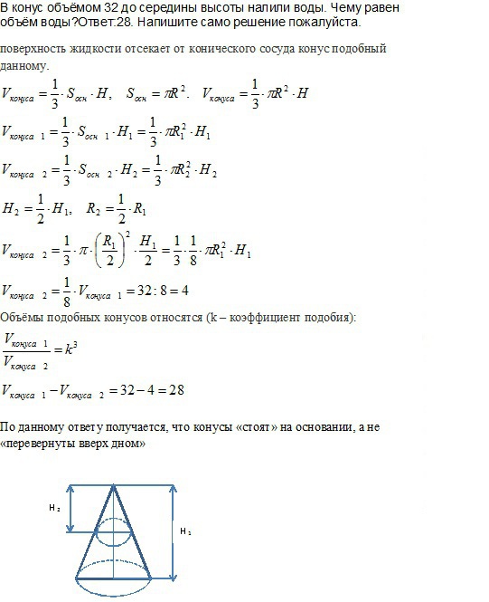 В конус объёмом 32 до середины высоты налили воды. Чему равен объём воды?Ответ:28. Напишите само решение пожалуйста.