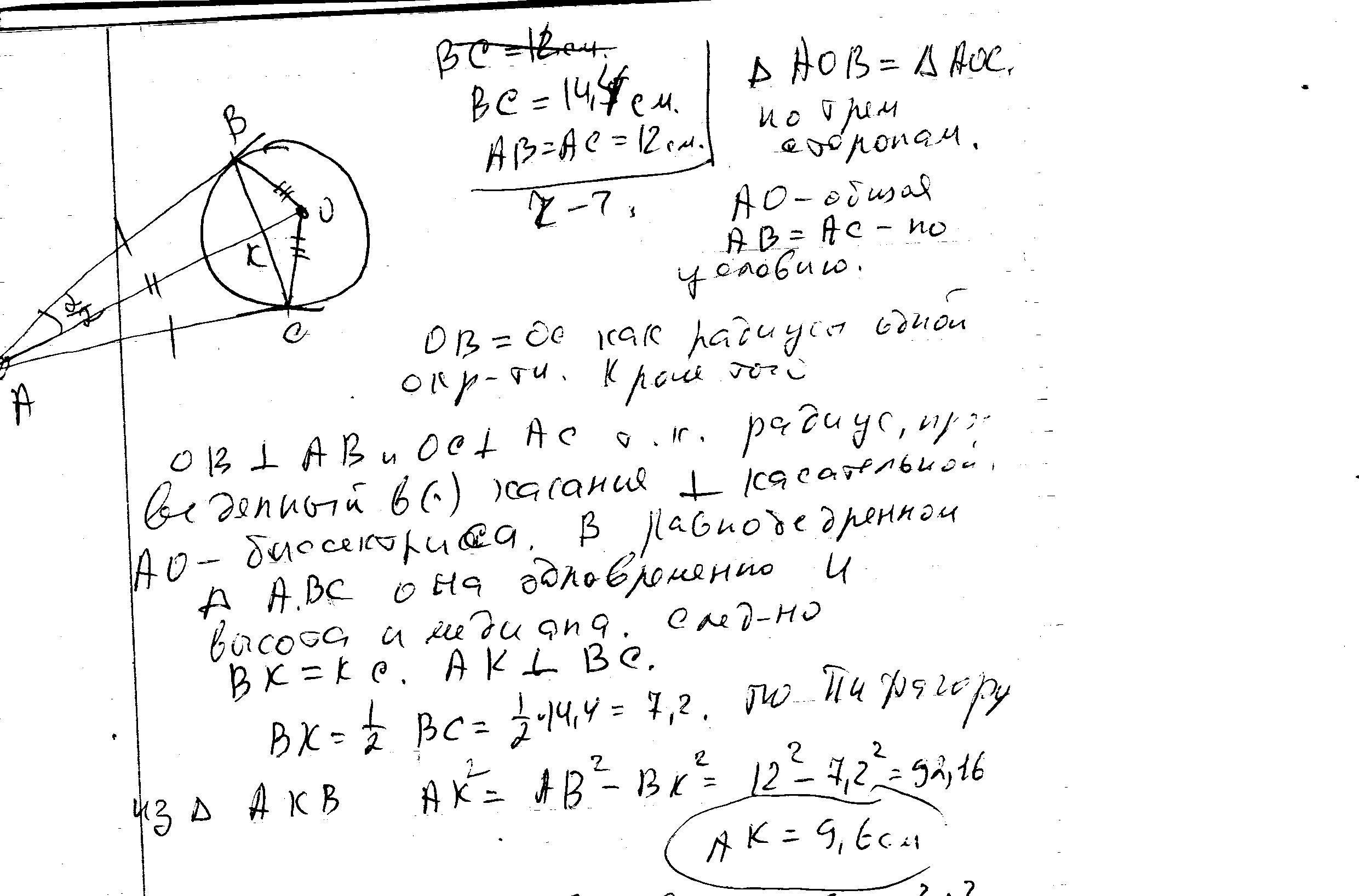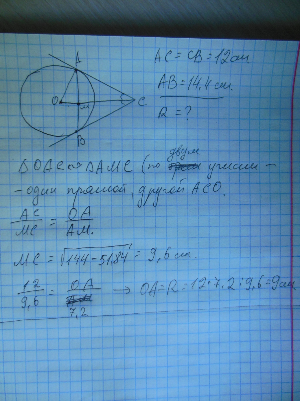 Из одной точки проведены к окружности две касательные длиной 12 см. Расстояние между точками касания 14.4 см. Найдите радиус окружности. Подробно, пожалуйста