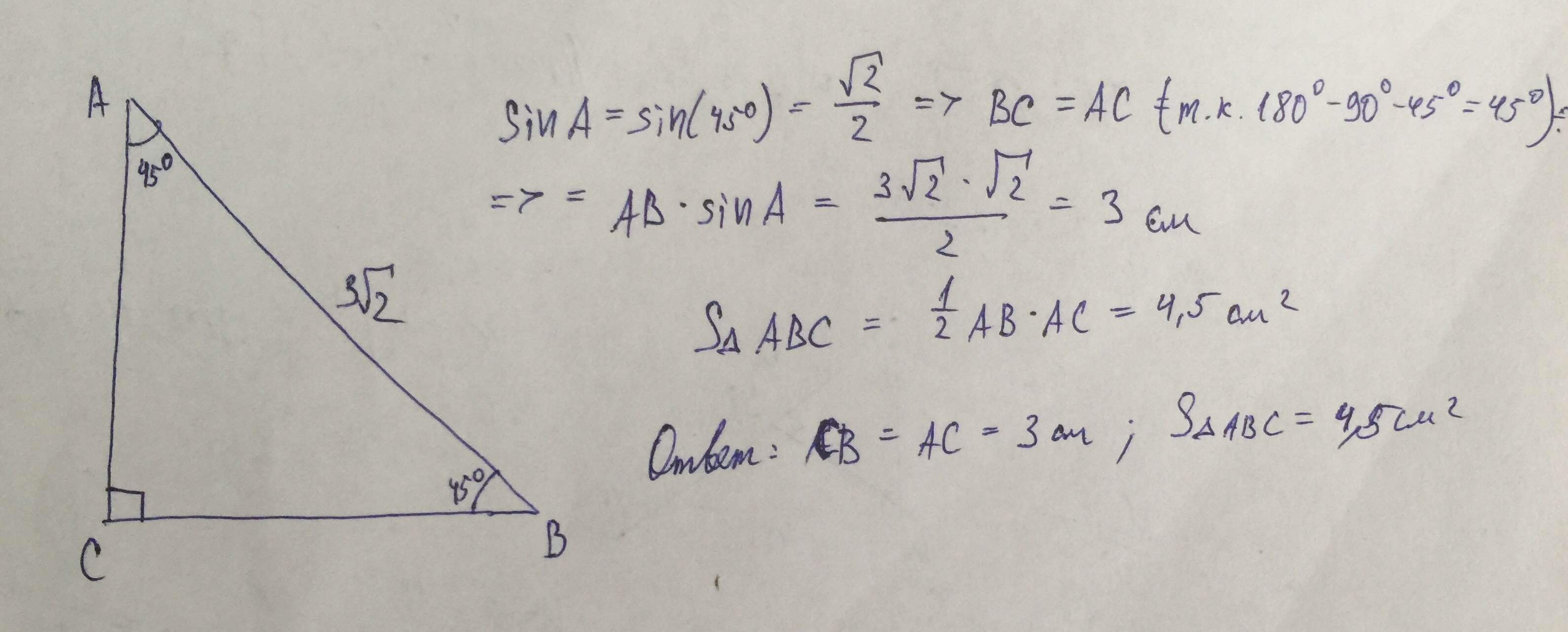 В прямоугольном треугольнике с острым углом 45° гипотенуза равна 3√2 см. найдите катеты и площадь этого треугольника.