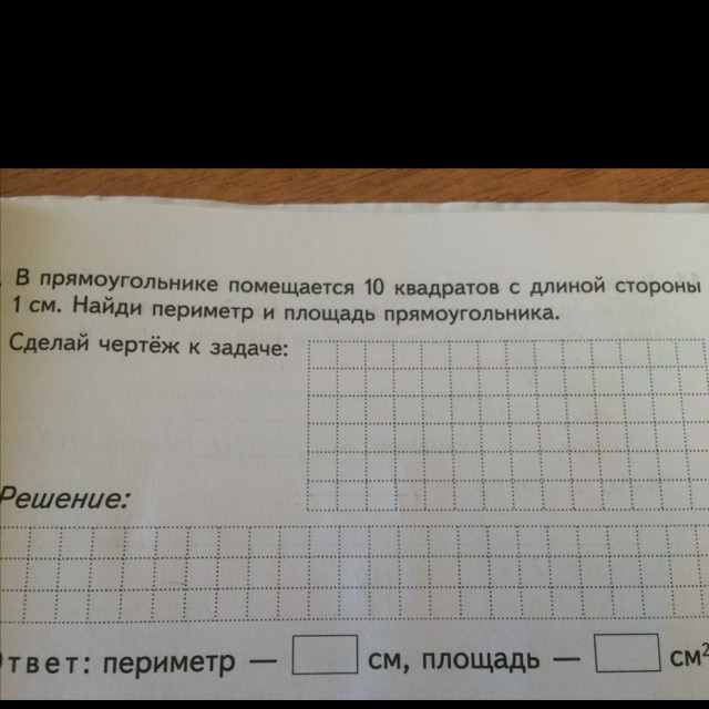 По условию задачи в прямоугольнике помещается 10 квадратов, следовательно пл прямоугольника в 10 раз больше пл квадрата, 1х10=10 кв. см
