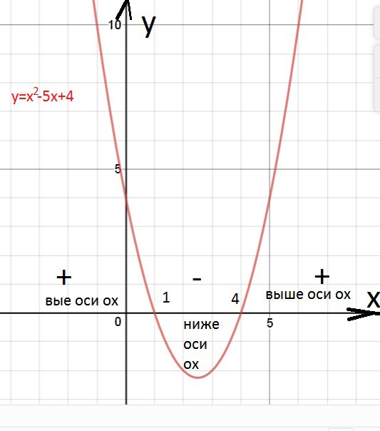 Метод интервалов. x²-5x+4>0. Пожалуйста научите,не умею делать. Желательно как показывает учитель. Напишите все что нужно делать,каждый шаг.