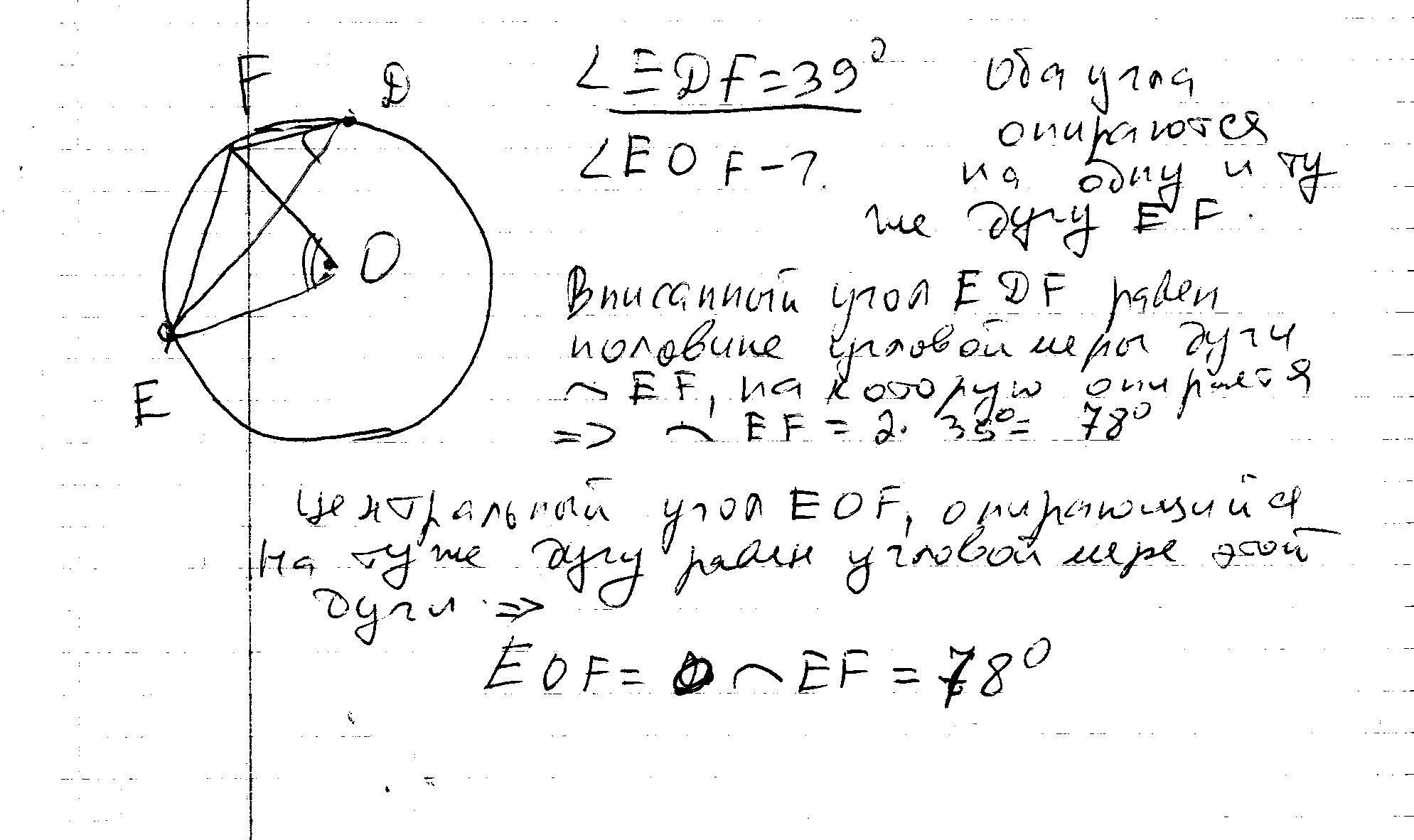 Точка D окружности и точка О-центр этой окружности- лежат по одну сторону от хорды EF.Найти угол EOF,если угол EDF=39 градусов