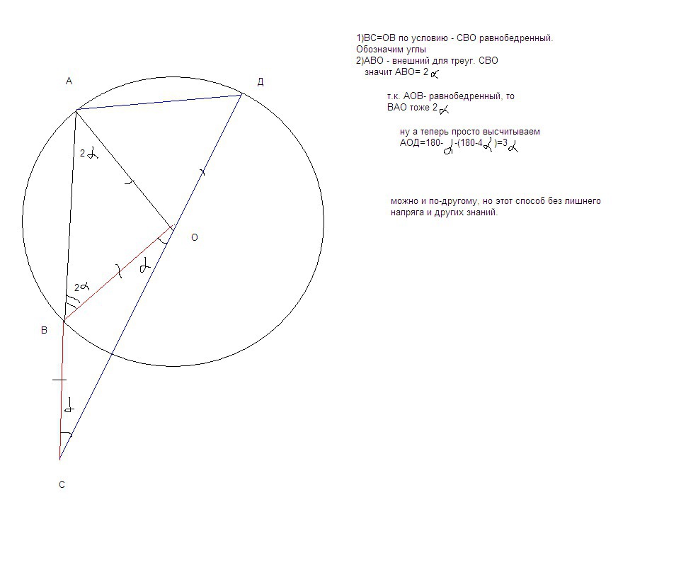 В окружности с центром O и радиусом R проведена хорда AB и продолжена на расстояние BC=R. Через точки C и O проведена секущая CD. Точка С лежит дальше от D, чем O. Докажите, что угол AOD=3ACD