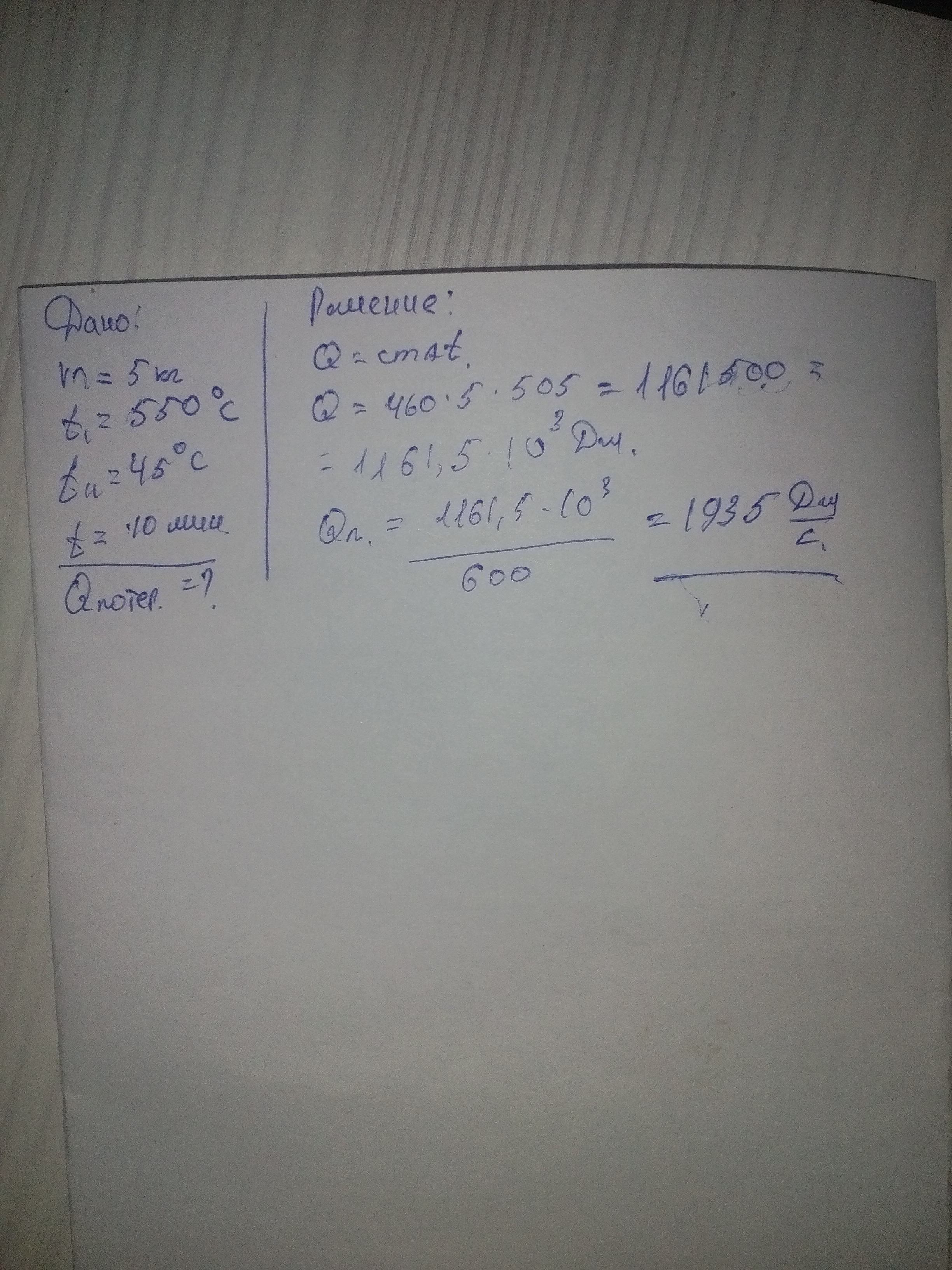 железный стержень массой 5 кг нагретый до 550 градусов Цельсия опускается в воду сколько теплоты ежесекундно теряет стержень, если за 10 минут он остыл до 45 градусов Цельсия