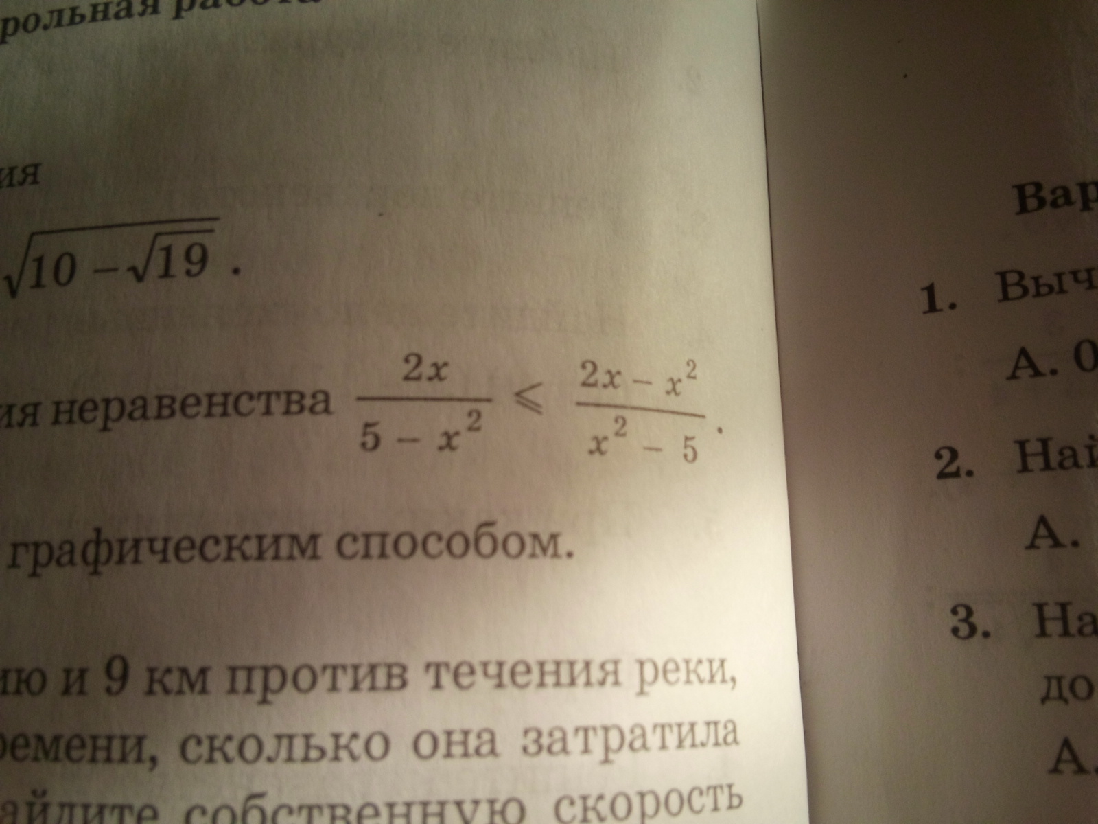 frac{2x}{5-x^2}  leq  frac{2x-x^2}{x^2-5} ; ,; ; ODZ:; ; x^2ne 5; ,; ; xne pm sqrt5\\ frac{2x}{5-x^2} + frac{2x-x^2}{5-x^2}  leq 0\\ frac{4x-x^2}{5-x^2}  leq 0\\  frac{x(x-4)}{(x-sqrt5)(x+sqrt5)}  leq 0\\+++(-sqrt5)---[, 0, ]+++(sqrt5)---[, 4, ]+++\\xin (-sqrt5,0, ]cup (sqrt5,4, ]