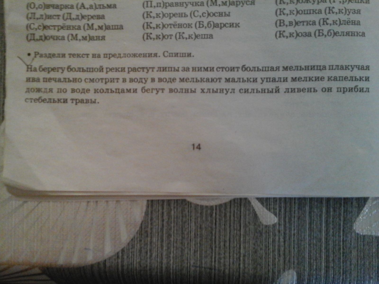 На берегу большой реки растут липы.За ними стоит большая мельница.Плакучая ива печально смотрит в воду.В воде мелькают мальки.Упали мелкие капельки дождя.По воде кольцами бегут волны.Хлынул сильный ливень.Он прибил стебельки травы.