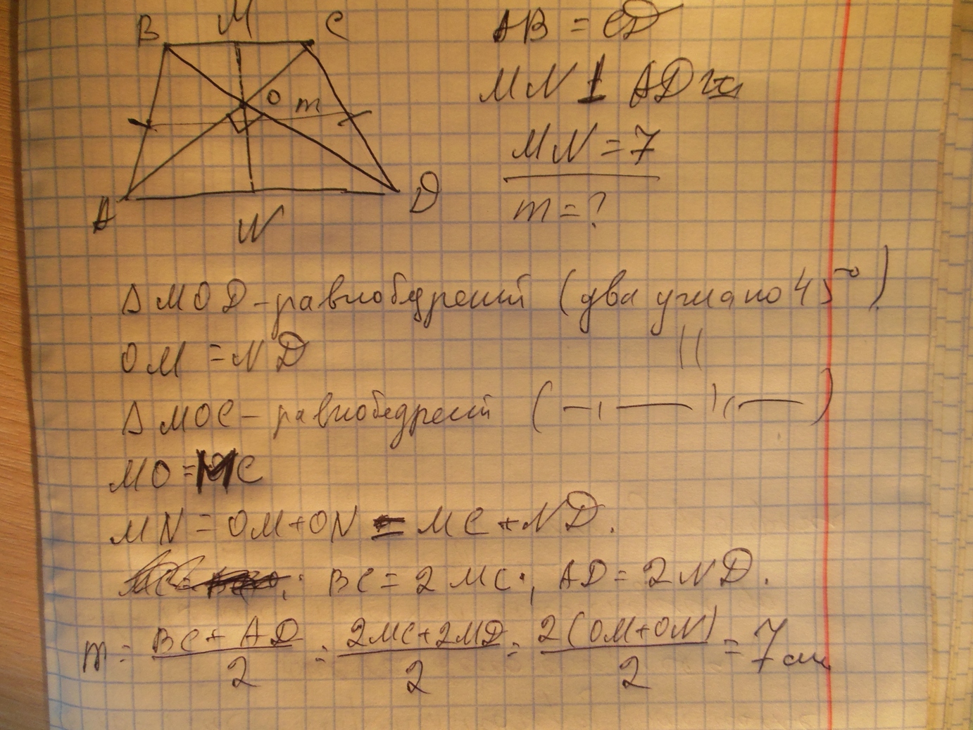 В равнобедренной трапеции диагонали перпендикулярны. Высота трапеции равна 7. Найдите среднюю линию