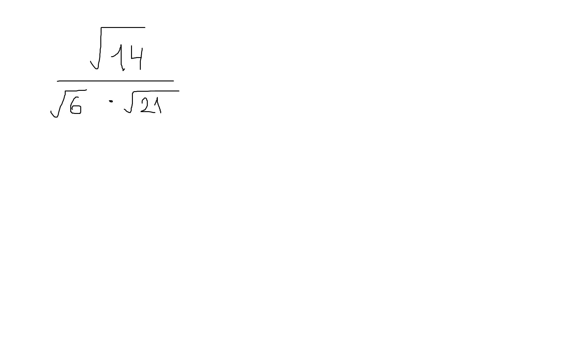 displaystyle  frac{sqrt{14}}{sqrt{6}cdotsqrt{21}} = sqrt{frac{14}{6cdot21}}= sqrt{frac{2cdot7}{2cdot3cdot3cdot7}}=sqrt{frac{1}{9}}=frac{1}{3}