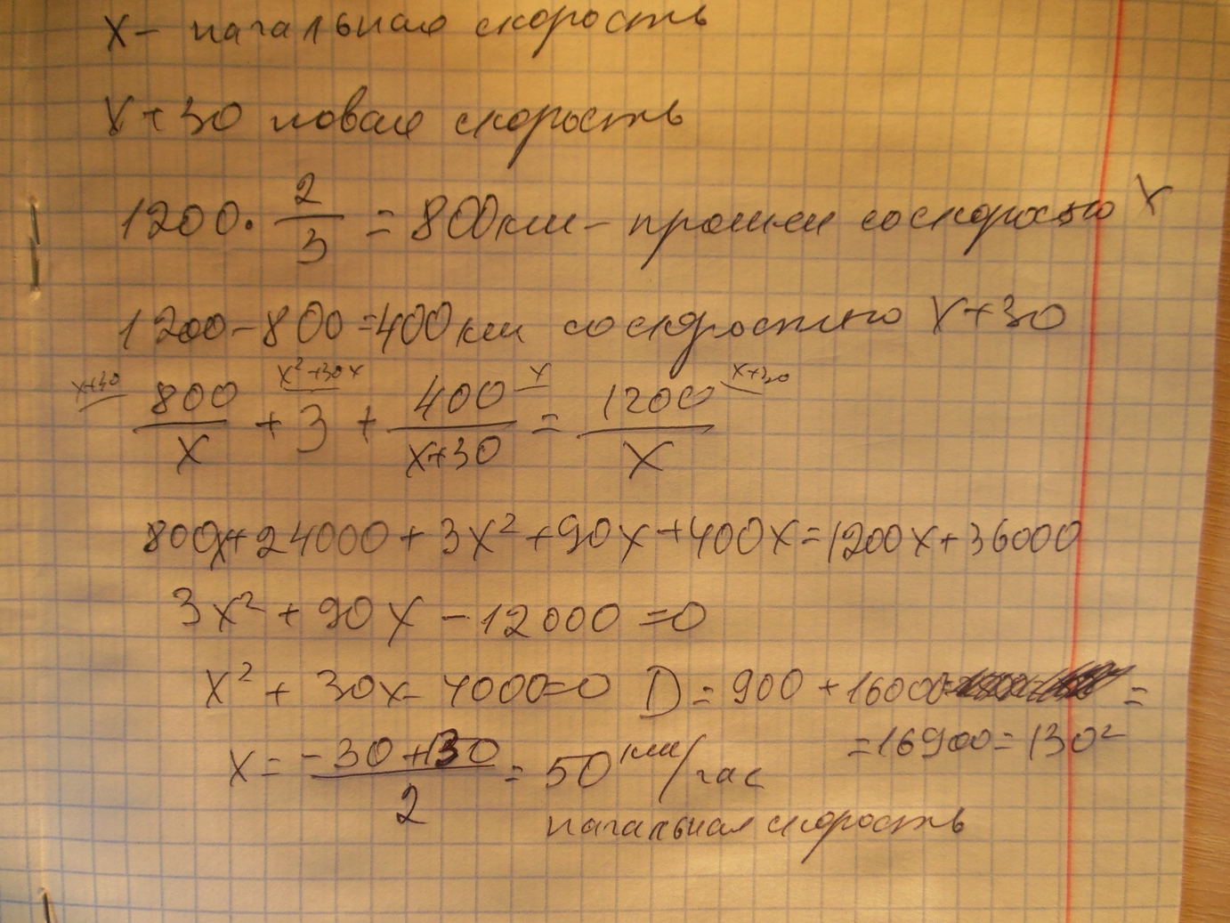 Поезд должен пройти 1200 км.После того,как поезд прошел 2/3 пути,он был задержан на 3 часа.Чтобы прибыть в пункт назначения вовремя,скорость движения была увеличена на 30 км/ч.Найти начальную скорость движения