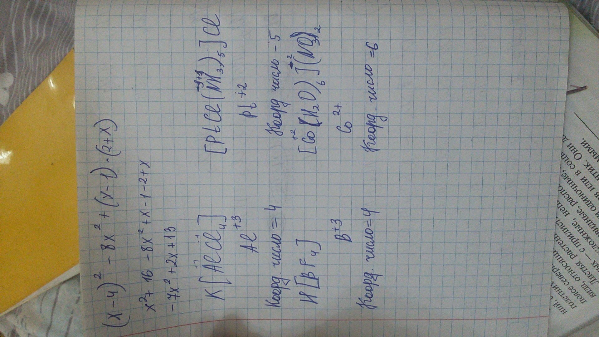 Укажите величину и знак заряда комплексного иона и колрдинационное число комплексообразователя в соединения: K[AlCl4],H[BF4],[PtCl(NH3)5]Cl,[Co[H2O)6](NO3)2