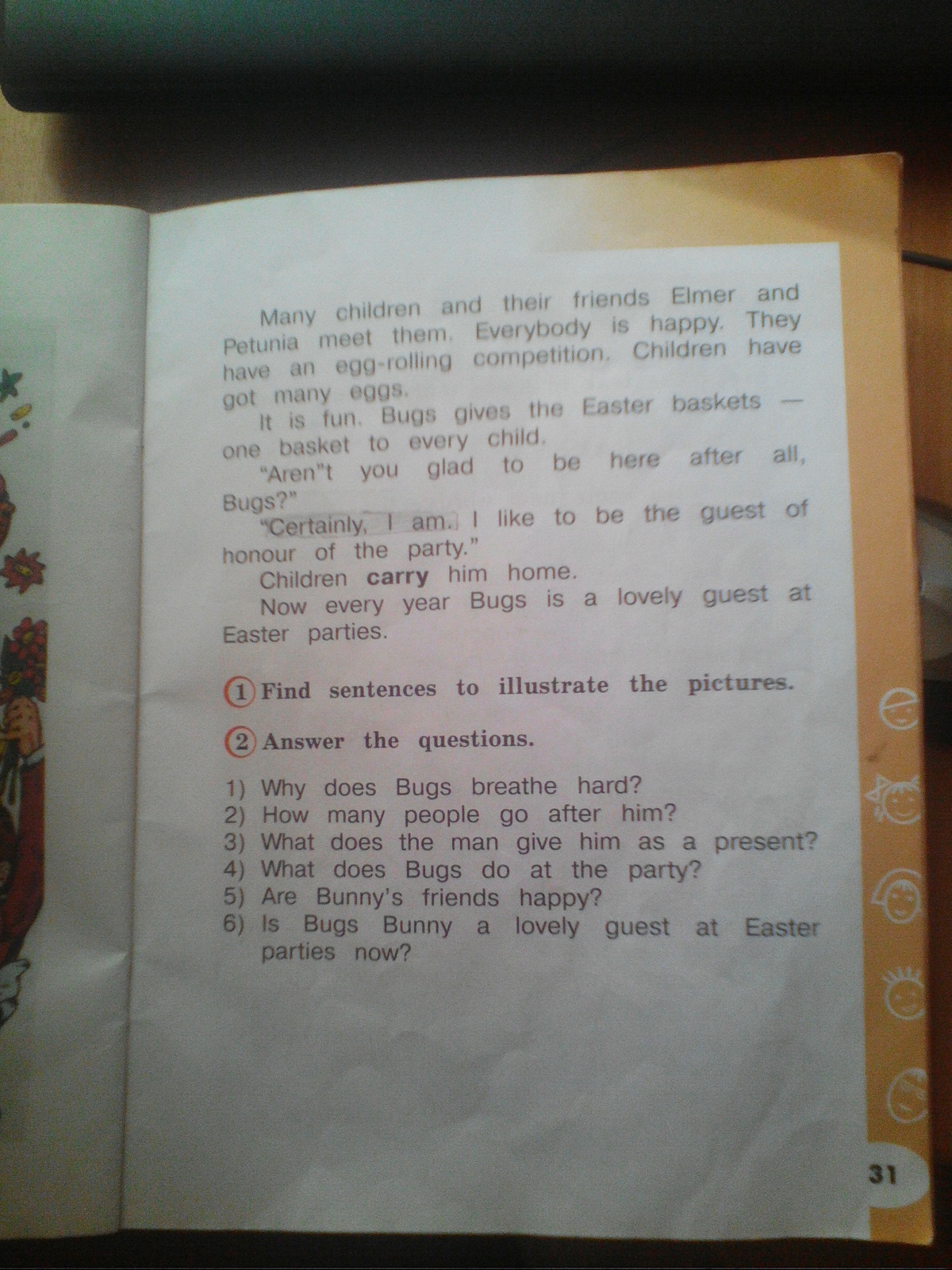 Многие дети и их друзья Elmer и Петуния встретиться с ними. Все довольны. У них есть яйца прокатки конкурс, дети получили много яиц. Пасхальные корзины Это весело. Ошибки дает одну корзину для каждого ребенка, быть здесь в конце концов, не так ли ждать ошибок? "" Конечно, я я я люблю быть почетным гостем партии. "Дети везти его домой. Теперь каждый год ошибки является прекрасным гостем на пасхальных сторон. C1 Найти предложения, чтобы проиллюстрировать картины. 2 Ответьте на вопросы: 1) Почему ошибки тяжело дышат? 2) Сколько людей идти за ним? 3) Что делает человек, дать ему в качестве подарка? 4) Что делать ошибки на вечеринке? 5) Есть ли друзья кролика счастливым? 6) Bugs Bunny прекрасный гость на Пасху сторон теперь?