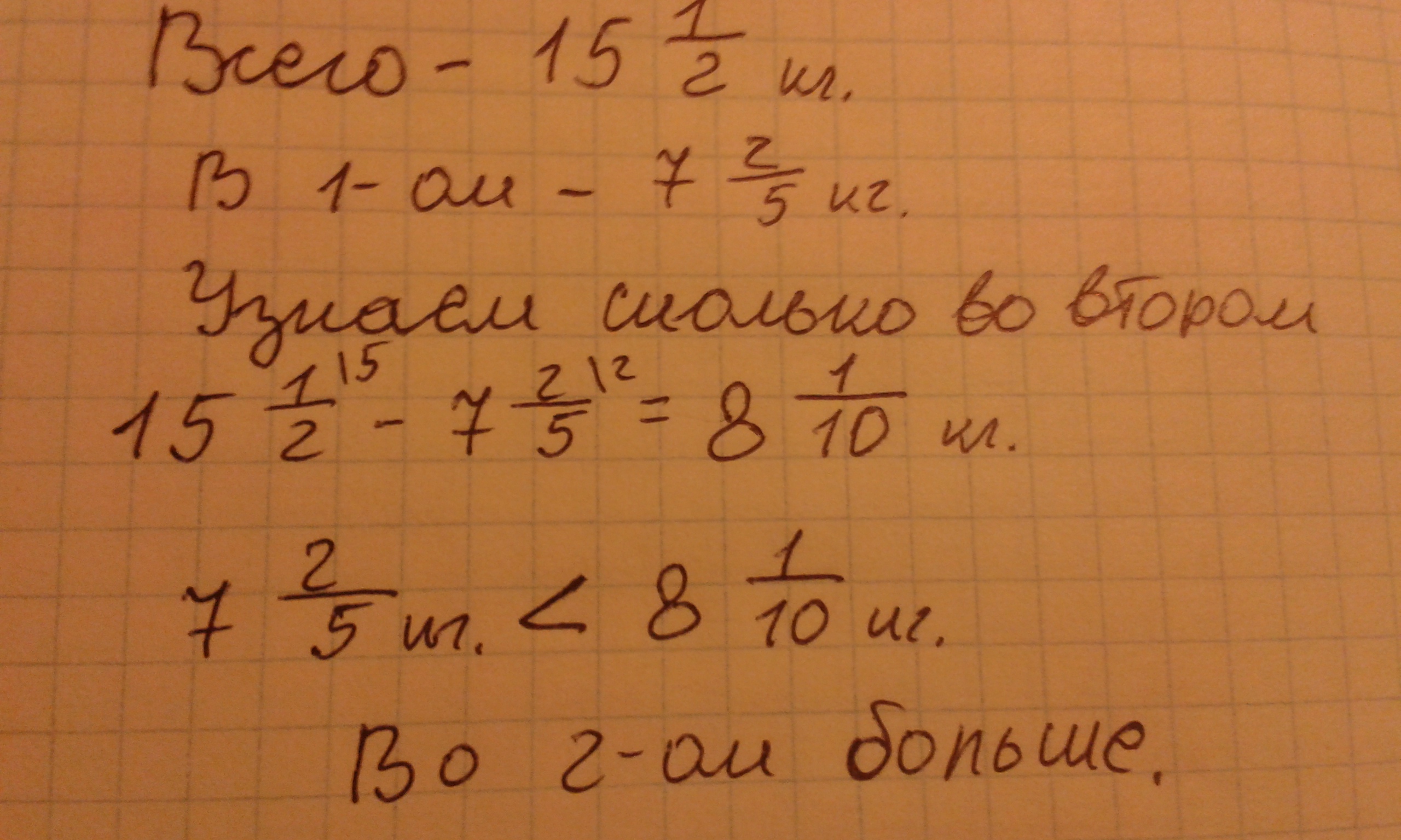 В двух мешках 15 целые одна вторая кг муки, причём в одном 7 целые две пятые кг. В каком мешке муки больше и на сколько?