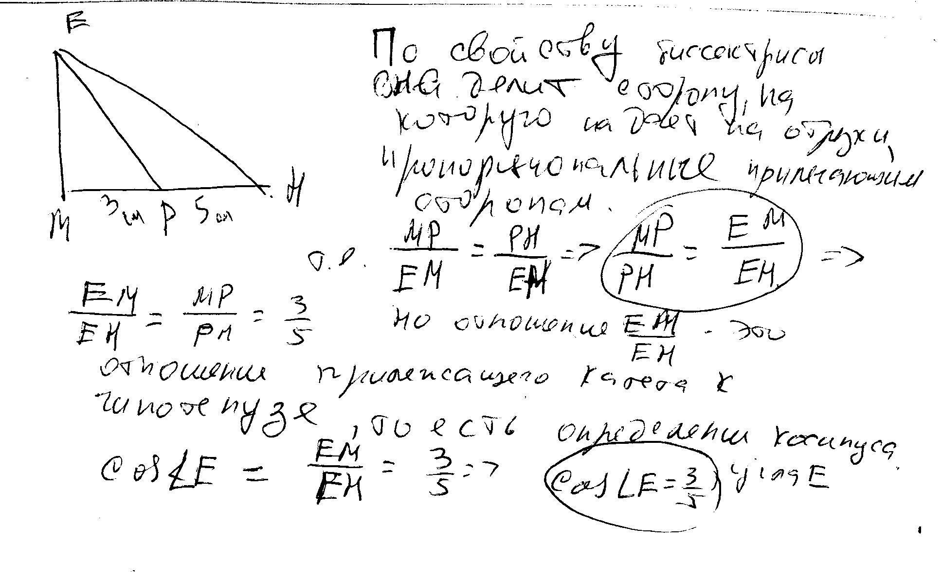 Биссектриса EP прямоугольного треугольника MEH(угол M=90 градусов) делит катет MH на отрезки 3 см и 5 см. Найдите косинус угла EHM.