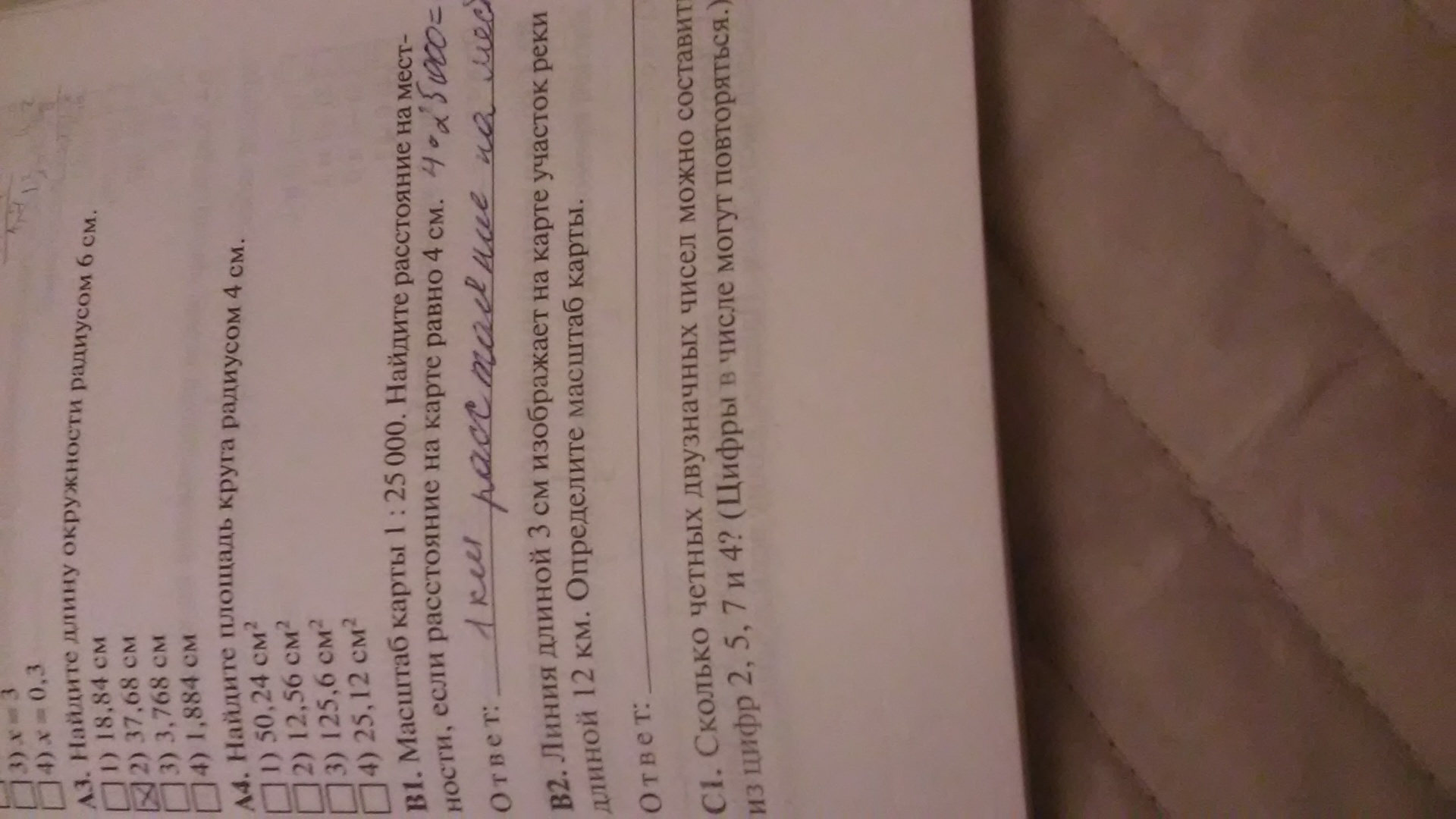 3 см ~ 12 км => 1 см ~ 4 км, то есть масштаб: в 1 сантиметре 4 километра