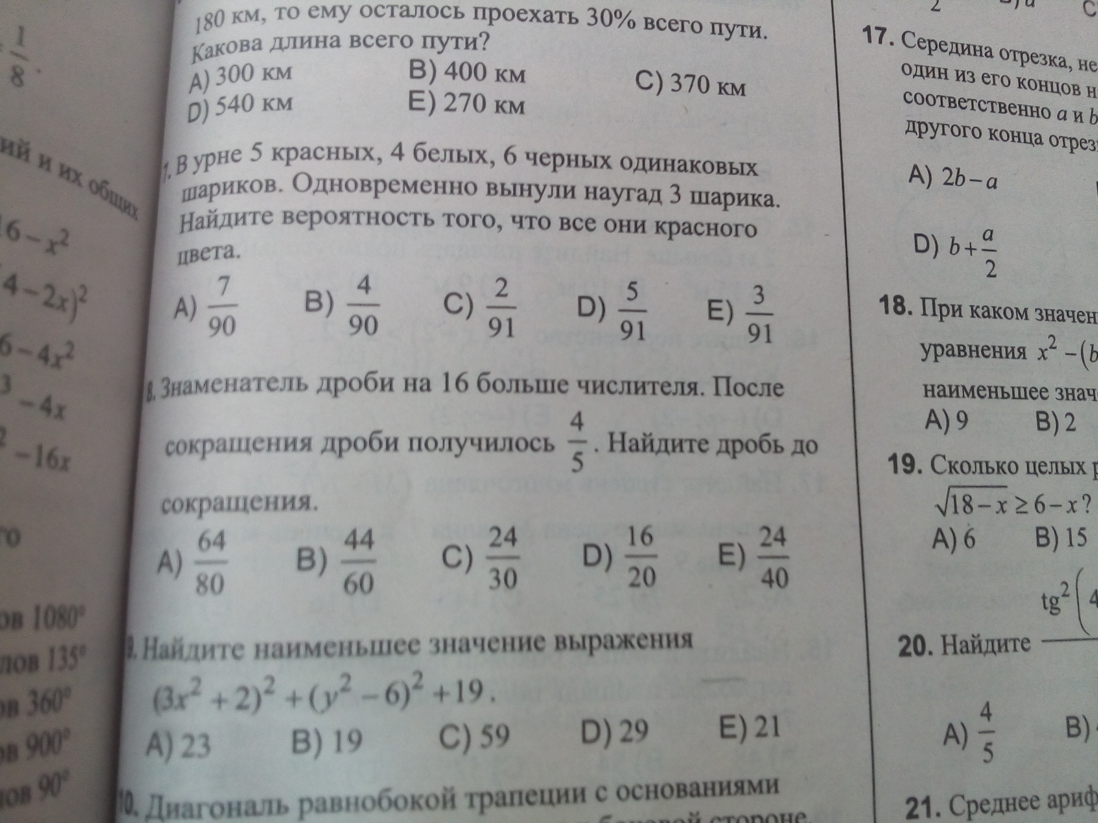 7) Вероятность равна 5/15*4/14*3/13=1/3*2/7*3/13=2/91 Ответ С). Сначала достаём 1 красный шар (5 из 15), осталось 4 красных шара и всего 14 шаров, тогда вероятность достать 2 красный шар равна 4/14=2/7. Для 3 красного шара осталось 3 красных шара и всего 13 шаров, то есть вероятность 3/13. Далее все вероятности перемножаем.