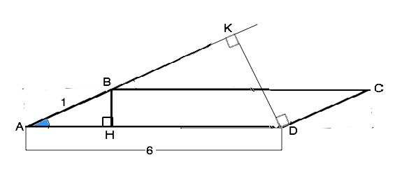На рисунке в приложении высота к меньшей стороне АВ пересекается с ее продолжением. Из прямоугольного треугольника AKD высота DK=AD•sinA=6•1/3=2 (ед. длины)