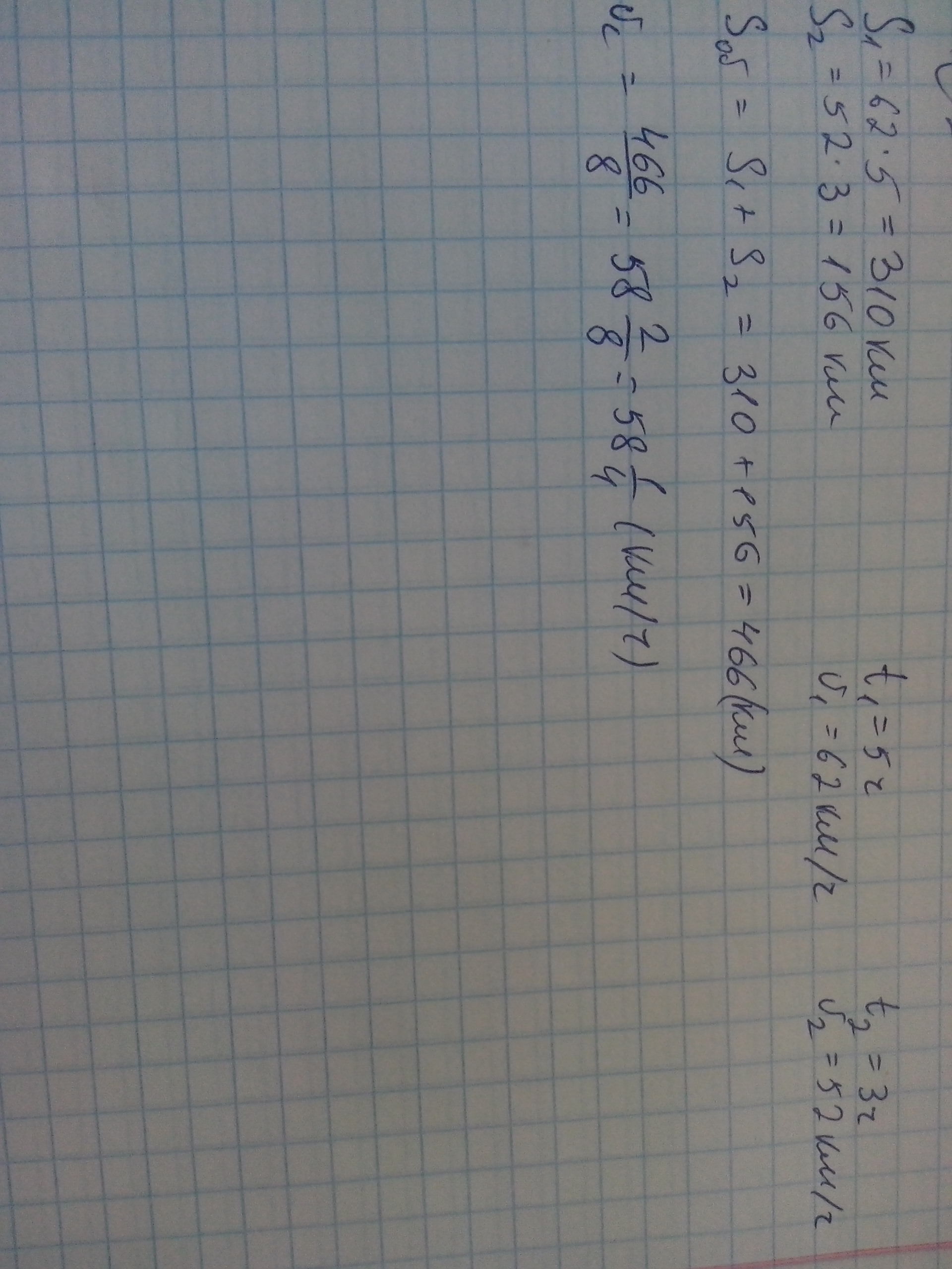Помогите пожалуйста решить задачу.Поезд ехал 5 ч со скоростью 62км.ч и 3 ч со скоростью 52 км.ч.Найдите среднюю скорость поезда за время движения.