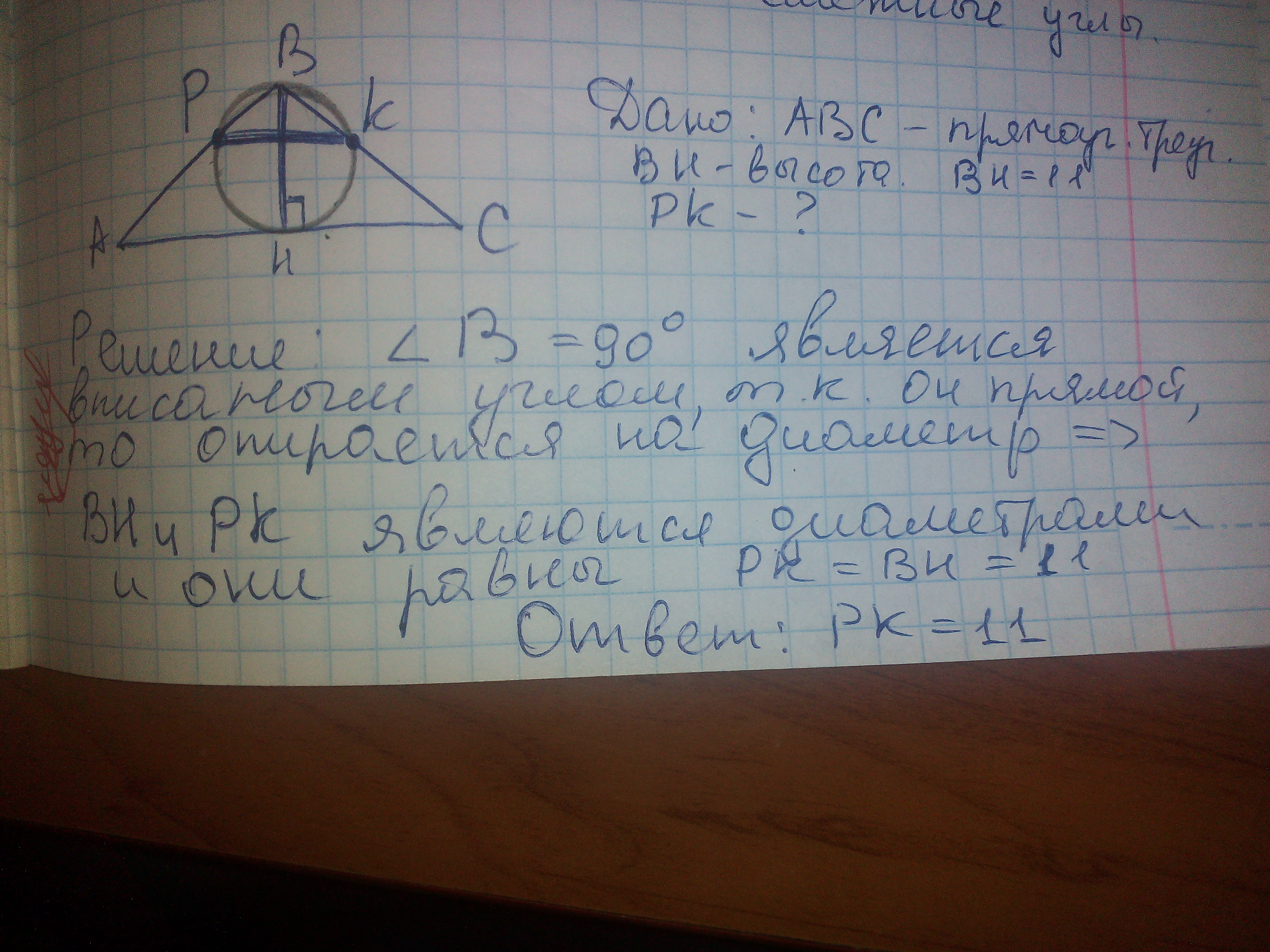 Точка H является основанием высоты BH, проведённой из вершины прямого угла B прямоугольного треугольника ABC. Окружность с диаметром BH пересекает стороны AB и CB в точках P и K соответственно. Найдите PK, если BH=11