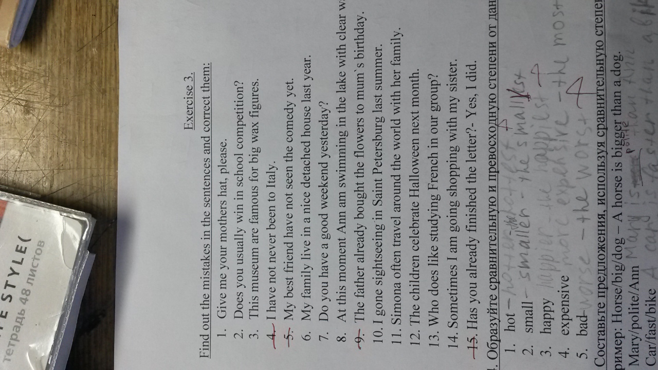 1mother's hat2do you usually...3this museum is famous...4I have never been...5has not seen6lives7did you have...8is swimming9the father has already bought10I went sightseeing...11travels12will celebrate13who likes...14sometimes I go shopping...15have you already finished the letter?Yes,I have.