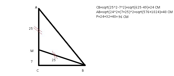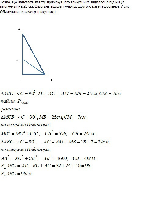 Точка, що належить катету прямокутного трикутника, віддалена від кінців гіпотенузи на 25 см. Відстань від цієї точки до другого катета дорівнює 7 см. Обчислити периметр трикутника.
