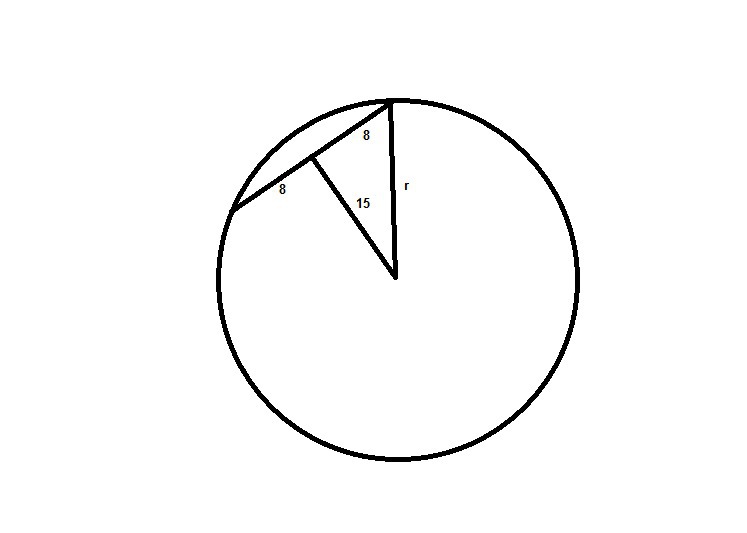 Радиус найдем из прямоугольного треугольника, изображенного на рисунке: r = √(15²+(16/2)²) см = 17 см.