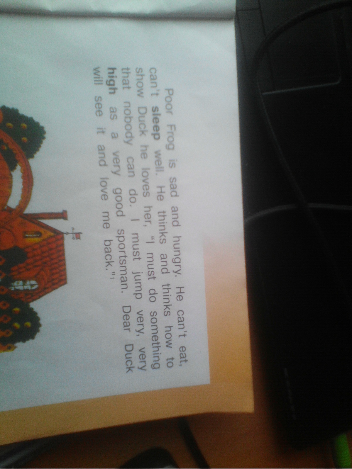бедная лягушка печальная и голодная.он не может кушать.не может хорошо спать.он думает и думает как показать утке что любит её.я должен что-то сделать,что никто не умеет.я должен прыгнуть очень-очень высоко,как очень хороший спортсмен.дорогая утка увидет это и полюбит меня снова.