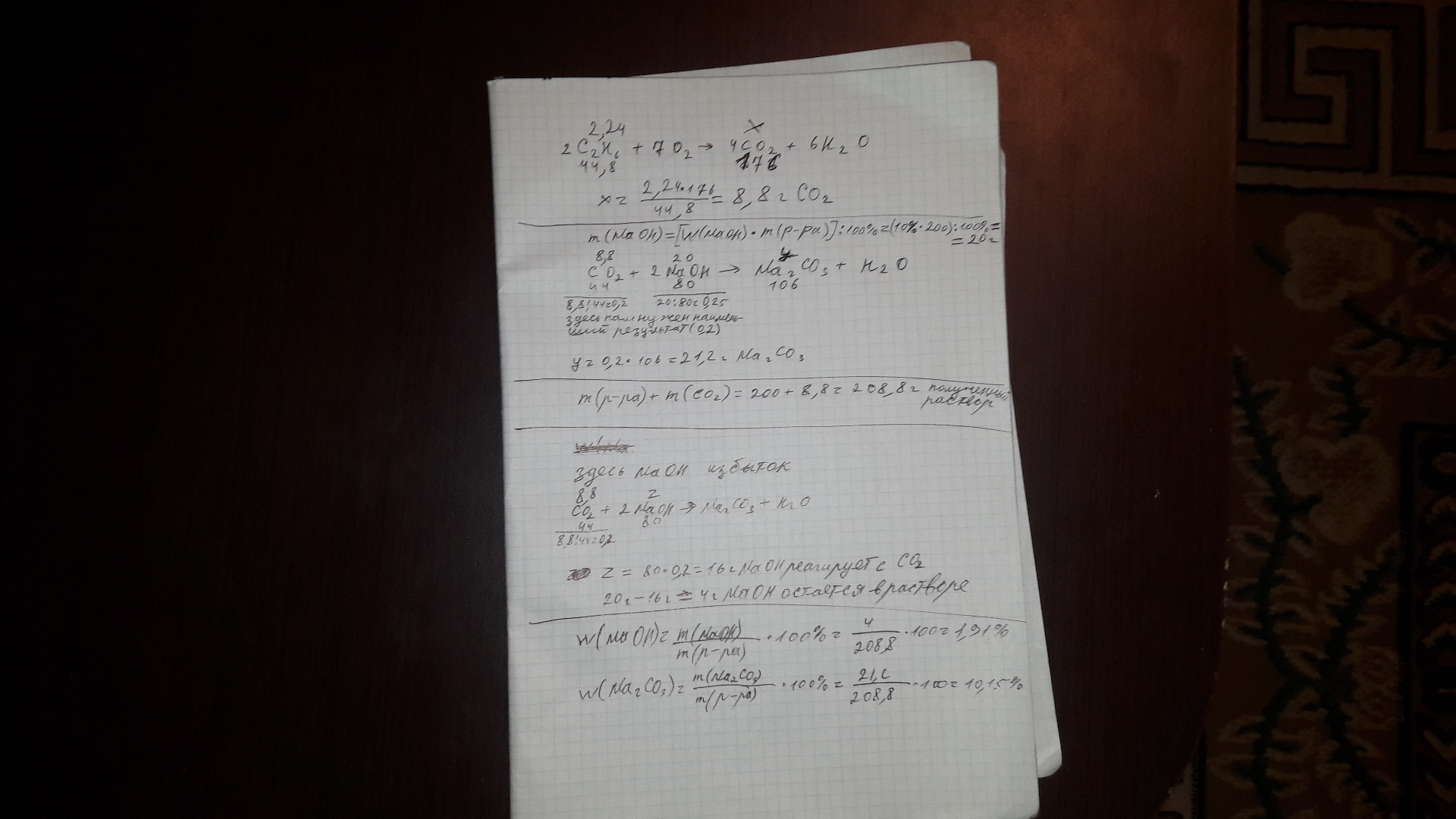Углекислый газ,полученный при сгорании 2,24 л этана,пропустили через 200 г 10 % раствора гидроксида натрия.Вычислите массовые доли веществ в полученном растворе.