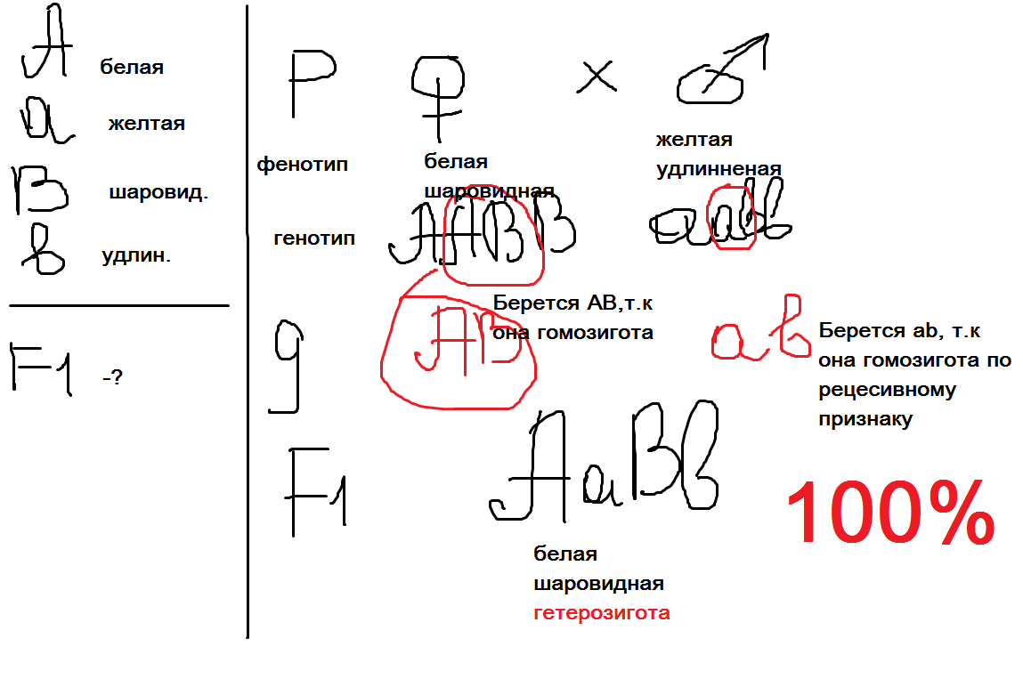 У фигурной тыквы белая окраска и шаровидная форма плодов-доминантные признаки.Желтая окраска и удлиненная форма плодов -рецесивные признаки.При скрещивании тыквы,с белыми шаровидными плодами,с тыквой имеющей желтые удлиненные плоды получены гибриды 1 поколения с белыми шаровидными иплодами.Определите генотипы скрещенных особей.