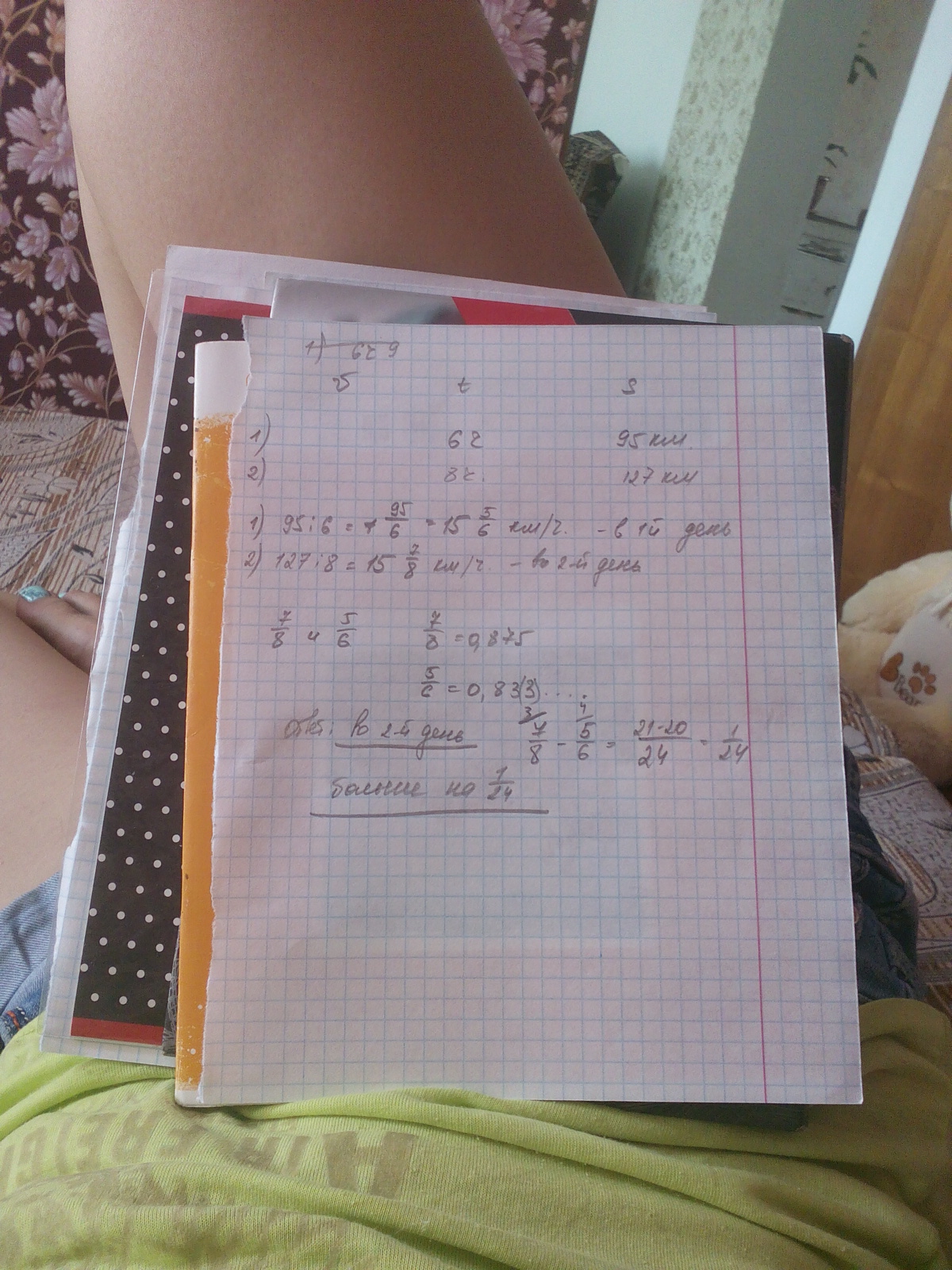 Ответ: во второй день скорость была больше на 1/24 км/час