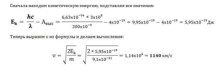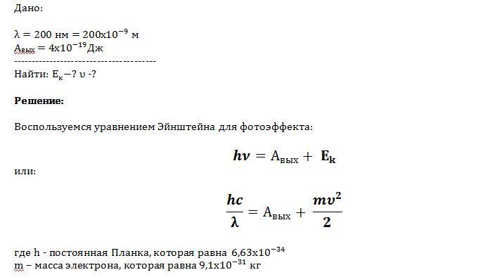 Какова кинетическая энергия и скорость фотоэлектрона вылетевшего из натрия при облучении его ультрафиолетом?Длина волны 200 нанометров, работа выхода 4*10^-18джоулей