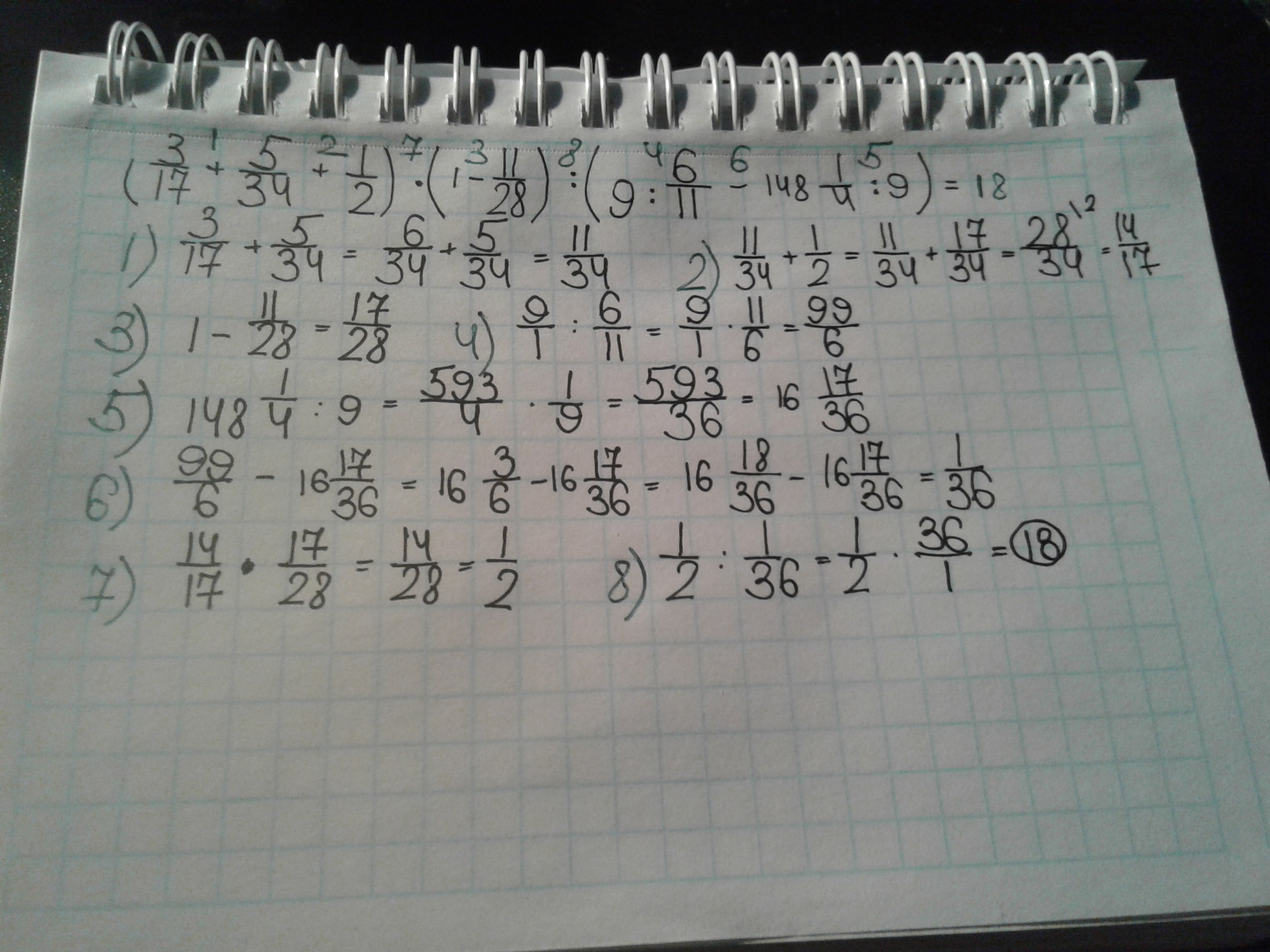 (3/17+5/34+1/2)*(1-11/28):(9:6/11-148 1/4:9)Помогите рассписать по действиям должно получиться 18