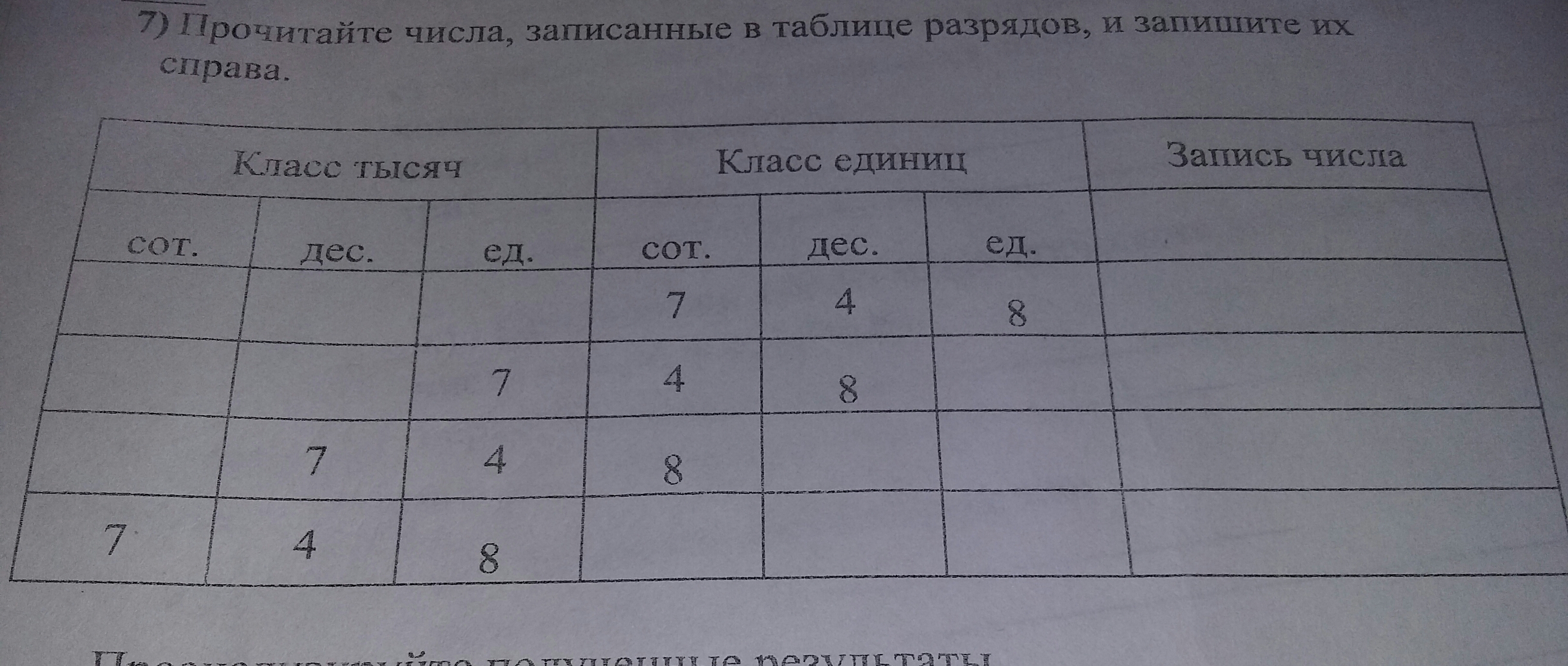 Прочитайте числа,записанные в таблице разрядов,и запишите их справа.