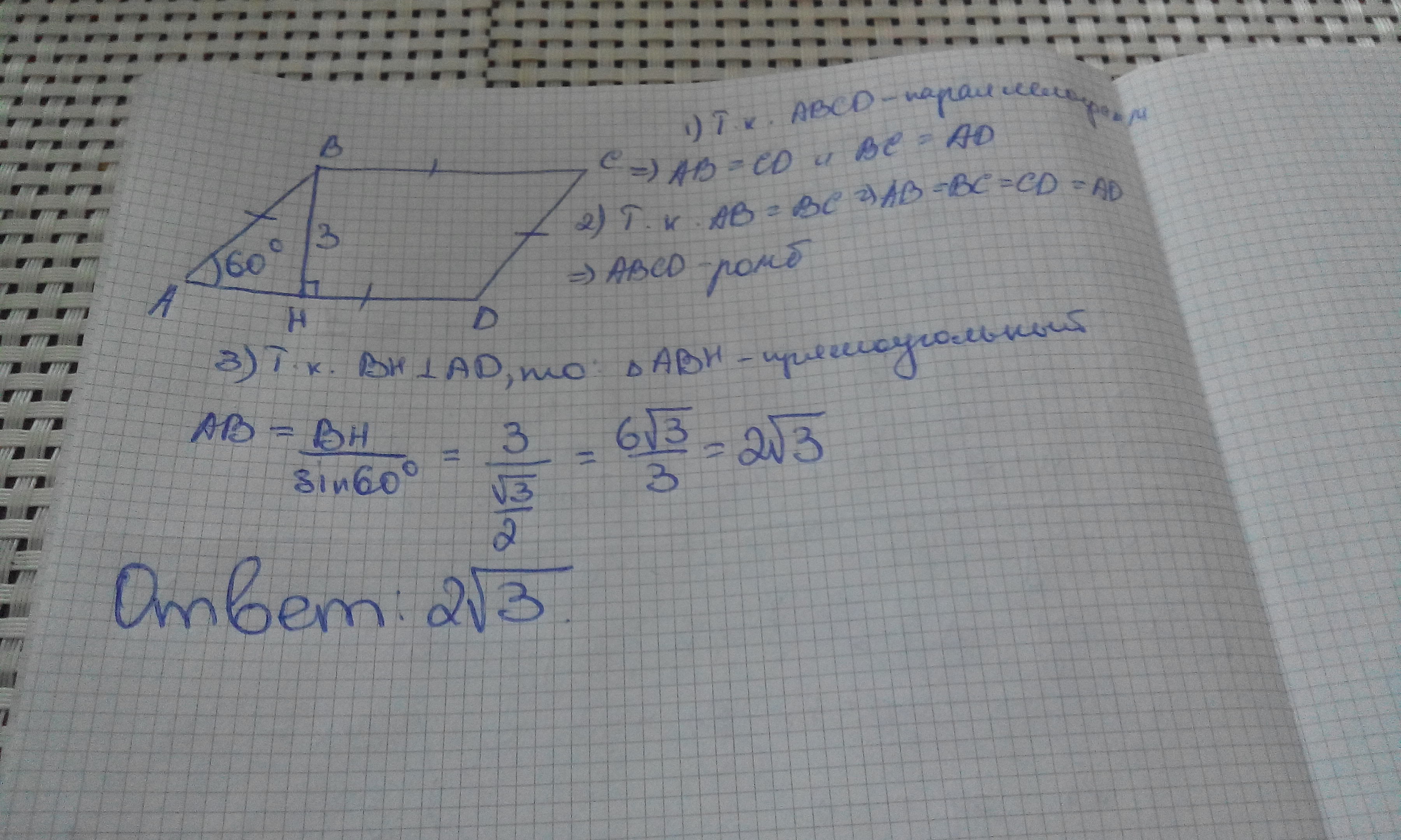 Дан параллелограмм, АВ = ВС, высота из угла В к стороне АD равна 3, угол А равен 60 градусов. Найти стороны параллелограмма. Очень срочно, помогите пожалуйста!