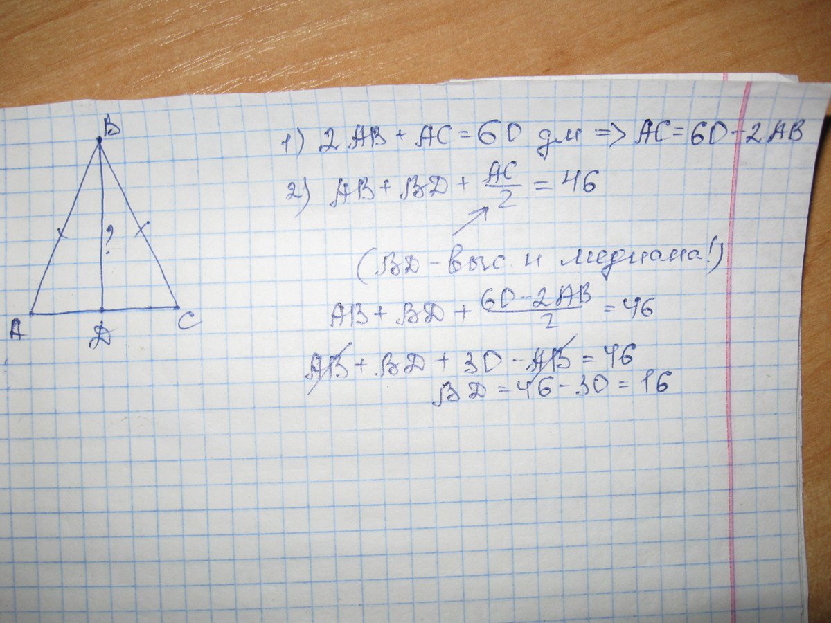 Периметр равнобедренного треугольника АВС равен 80см, ВД-высота, опущенная на основание. периметр треугольника АВД равен 52см. найдите высоту ВД