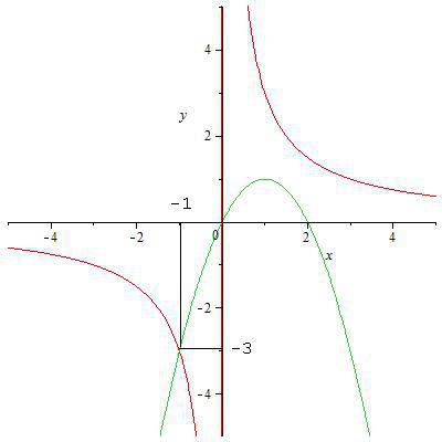 Зеленым показана квадратная парабола функции в правой части, красным - ветви гиперболы левой части. Точка пересечения указывает решение х=-1