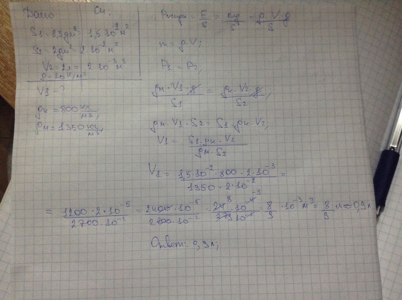 сколько литров мёда надо налить в цилиндрический сосуд с площадью дна 1.5 дм2, чтобы его давление на дно сосуда было равно 2л керосина, оказываемому на дно сосуда цилиндрической формы с площадью дна 2дм2? Ответ округлите до десятых долей литра.