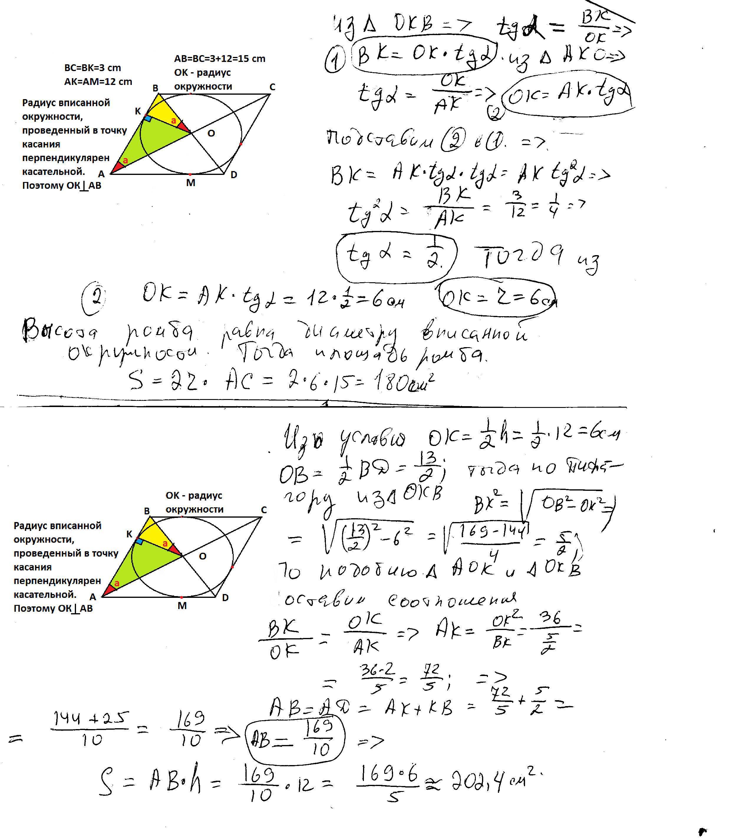 1) Найти площадь ромба, если точка касания вписанного в ромб круга делит сторону на отрезки 3 см и 12 см.