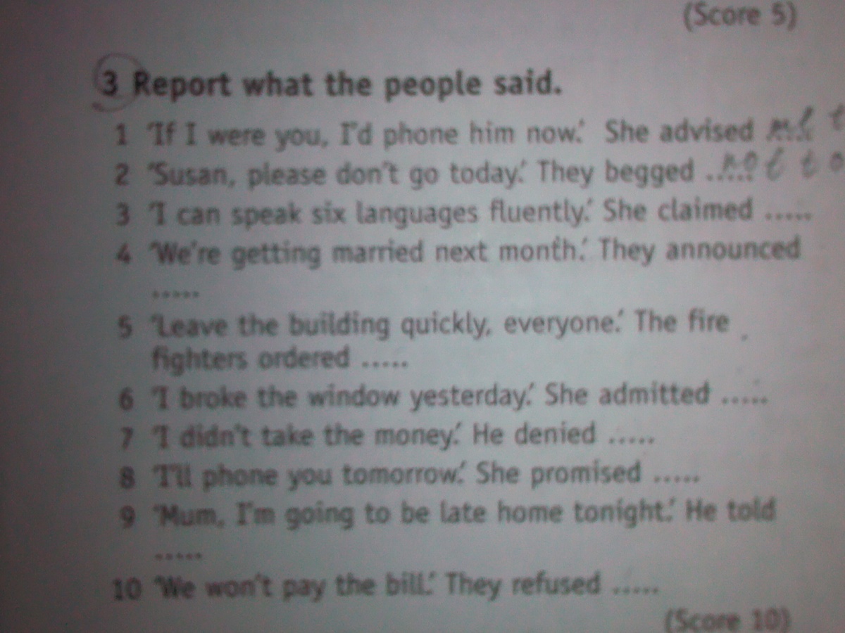 3. 1..me to phone him 2. ...not to go. 3. ..that she could speak 6 languages.4. that they were getting married 5. to leave building 6.that she had broke the window 7. taking the money 8. to phone me tomorrow 9.mom that he eas going to be late