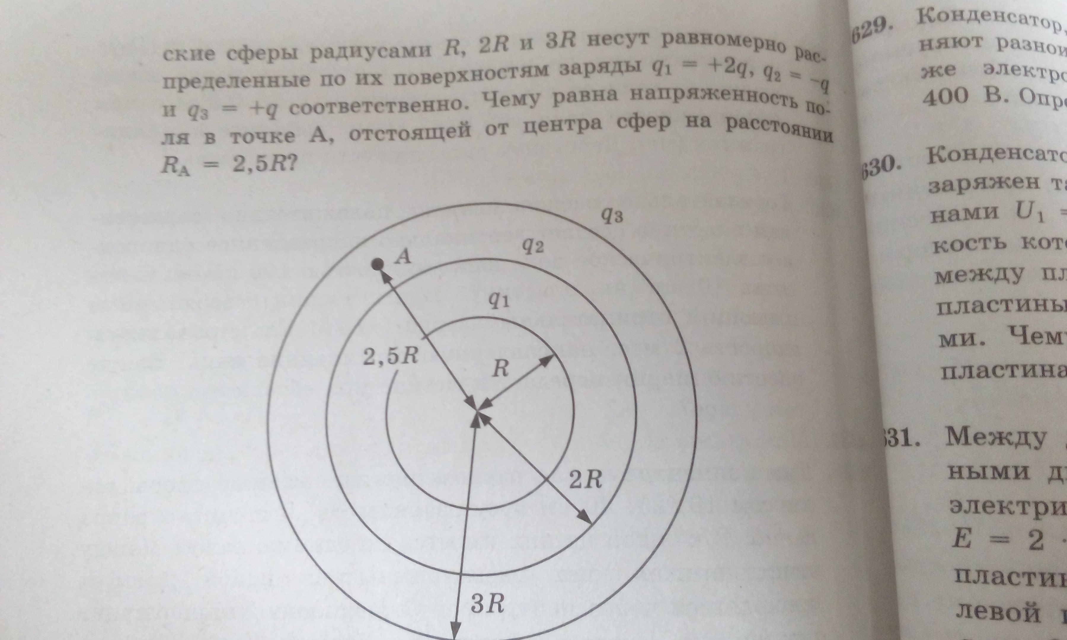 Точечный заряд q создает на расстоянии R электрическое поле напряженностью 62,5 В/м. Три концентрические сферы радиусом R,2R,3R ... смотри на фото.
