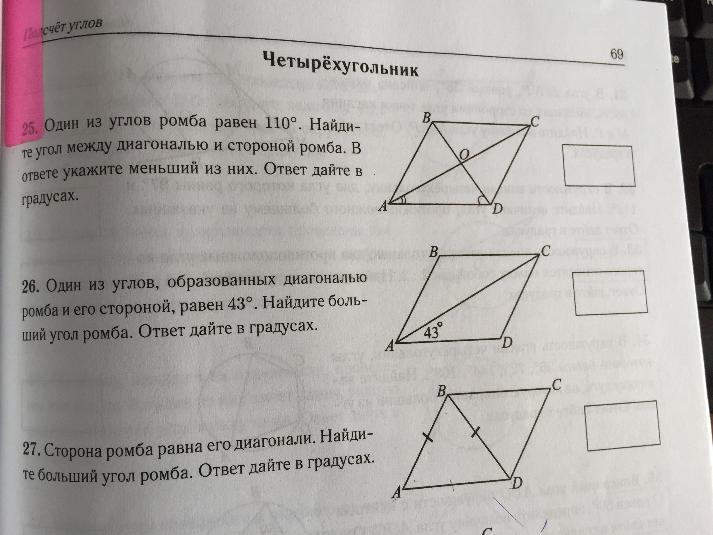 Один из углов ромба равен 110°. Найдите угол между диагональю и стороной ромба. В ответе укажите меньшее из них. Ответ дайте в градусах.
