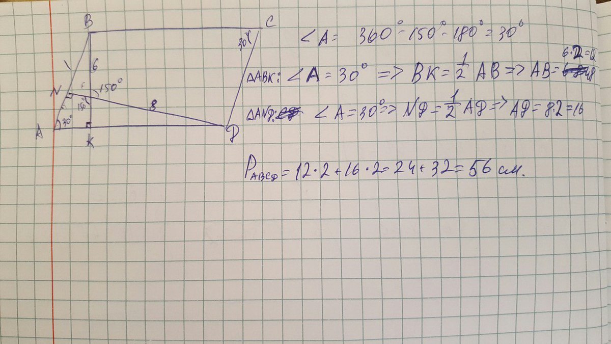 Угол между высотами параллелограма, которые равны 6 см и 8 см, составляет 150 градусов. Найдите периметр параллелограма.