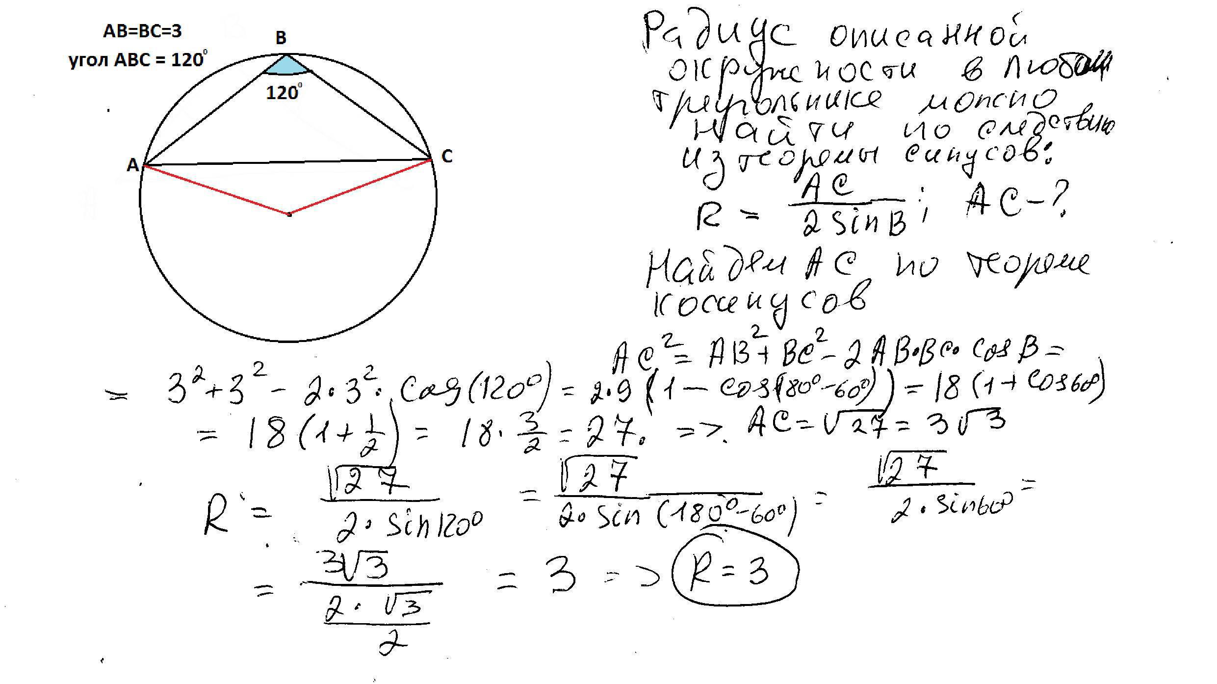 угол при вершине равнобедренного треугольника равен 120 градусов,а боковая сторона равна 3.