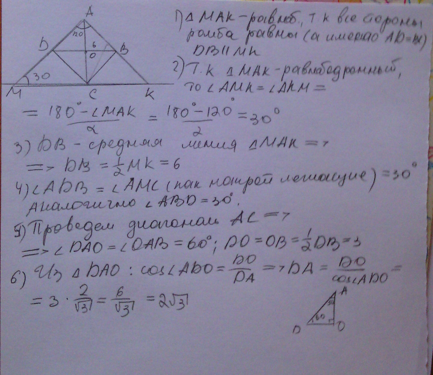 В ромбе ABCD тупой угол равен 120. Через вершину C проведена прямая , параллельная диагонали B, которая пересекает прямые AB и AD в точках K и M соответственно. Найдите сторону ромба, если KM=12см