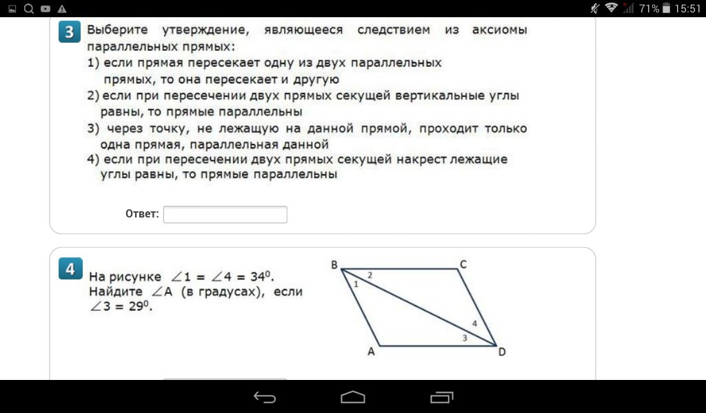 4) ABCD - параллелограмм, у параллелограмма противоположные углы равны, т.е. ∠B=∠D, ∠A=∠C
