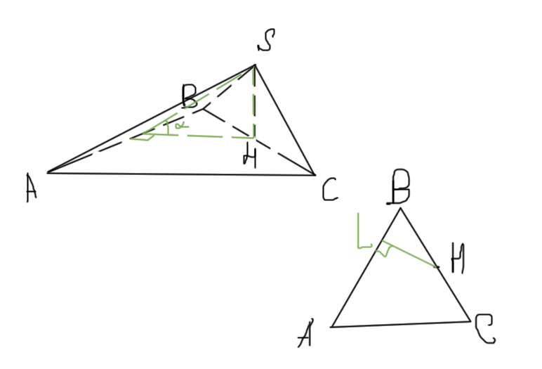 нужно найти высоту SH: опустим из точки Н высоту LH на АВ,LH=SH,т.к треугольник прямоугольный(с углом 45° и LH и SH катеты это треугольника)